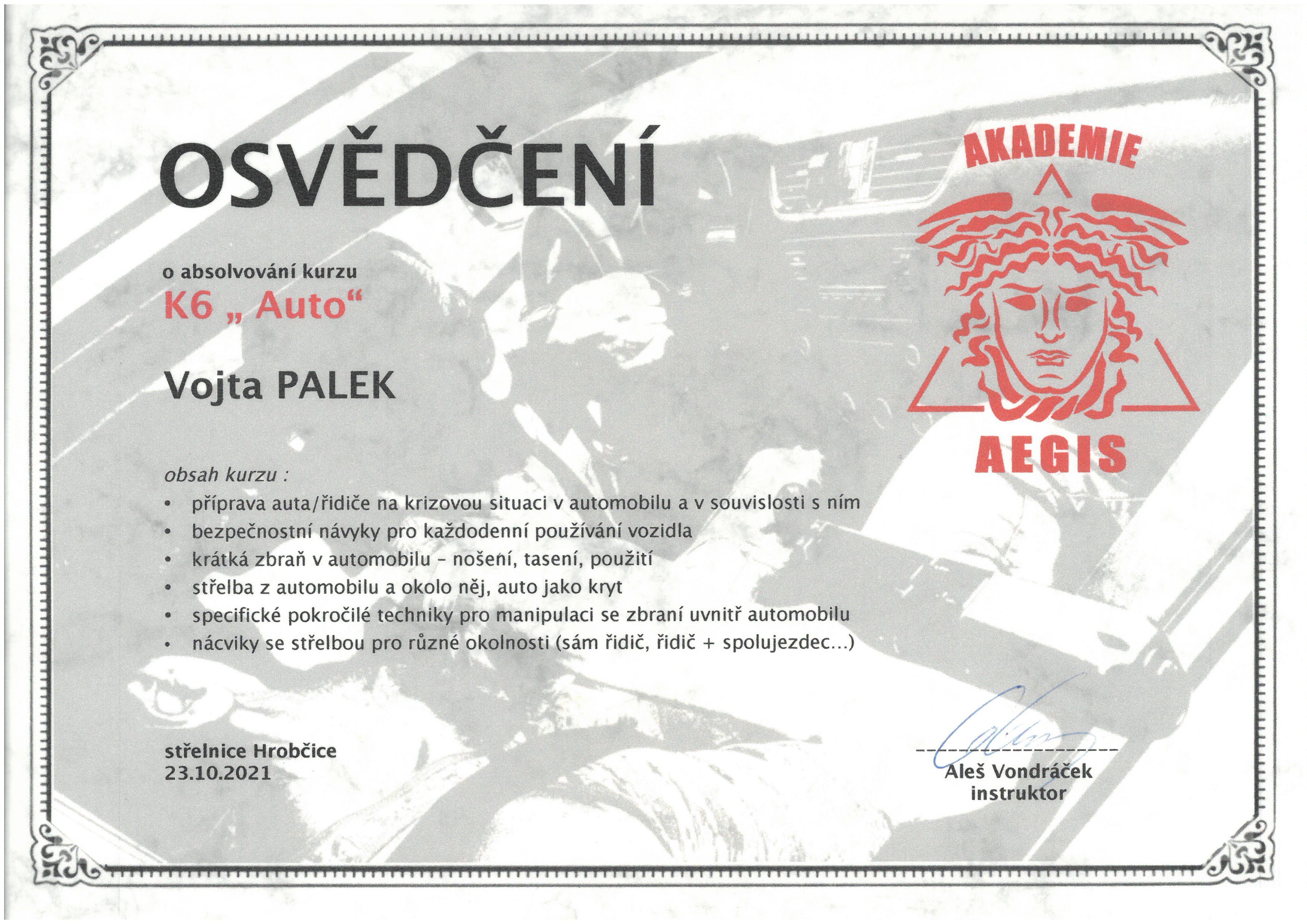 Na začátku léta 2021 jsem se pod vedením Aleše Vondráčka z Akademie Aegis zúčastnil neveřejného tréninku. Tento trénink měl jedno jediné zaměření. Problematiku střelby v autě a okolo auta. Pod vedením tohoto zkušeného instruktora jsem absolvoval již více jak dvě desítky různě zaměřených celodenních tréninků, ale byl to právě tento trénink se zaměřením na auto, který ve mě zanechal nejsilnější dojem. Možná proto, že střelba z auta se na většině střelnic provozovat nedá. Možná proto, že to bylo tak odlišné od ostatních tréninků. V každém případě, když jsem zjistil, že je vypsán termín na kurz K6 auto, tak jsem okamžitě psal email s přihláškou. Bohužel ani po 14 dnech od odeslání mého emailu jsem nedostal odpověď, a tak jsem zkusil napsat na jinou adresu. Ale výsledek byl stejný. Po týdnu čekání jsem to zkusil ještě přes SMS. Několik dnů na to jsem dostal odpověď, že místo na kurzu mám rezervované a že mé emaily skončily mezi spamy. Platba za kurz, 2.500Kč, probíhala převodem na účet. A jak již je obvyklé zhruba týden před začátkem kurzu přišly doplňující informace ohledně vybavení, množství střeliva atd. Jednou z podmínek účasti na tomto kurzu, je předchozí absolvování kurzu K2, a to hlavně ze dvou důvodů: 1/ Často se střílí pouze jednou rukou. 2/ Vozidlo se zároveň využívá i jako kryt. Je to ale i nutnost určité vyspělosti střelce, zejména v oblasti bezpečné manipulace se zbraní. Přece jen střelba v autě není úplně běžná. Navíc, když ji provádíte přes řidiče, popřípadě spolujezdce, tak zde není prostor pro chyby. Tento kurz byl netradiční v tom, že byl pod vedením pouze jednoho z instruktorů Akademie Aegis, Aleše Vondráčka. Další, co bylo neobvyklé, že celá polovina kurzu až do oběda, byla teoretická část a suchý nácvik. Rozhodně to ale nebyla nuda. Dozvěděli jsme se, jak si správně nastavit pracoviště řidiče. Jak se chovat, když přicházíme k vozidlu, nasedáme, odjíždíme, přijíždíme a vystupujeme. Co dělat a nedělat při řízení, abychom nezvyšovali riziko. Jak se chovat v koloně. Co je vhodné ve vozidle vozit a kam co dávat. Jak se chovat jako spolujezdec, když řidič za jízdy zkolabuje. Dále jsme si zkoušeli tasení ze sedadla řidiče a střelbu do 360°. To samé, ale ze sedadla spolujezdce. Střelbu přes spolujezdce a střelbu přes řidiče. Po tomto zhruba 4hodinovém bloku následoval půl hodinový oběd. Po něm jsme se rozstříleli. Nejprve mířenou střelbou, následovanou tasením ve stoji. Potom jsme stříleli z kleků, čelem a do boků. Ze střelby oběma rukama jsme přešli na střelbu dominantní rukou. Následovala střelba do boku v sedě přes kolegu spolujezdce a řidiče. Protože vše probíhalo bez problémů, pokročili jsme k nejzajímavější části dne, střelbě z auta. Nejprve jsme každý sám stříleli ze svého auta z pozice řidiče okýnkem řidiče a spolujezdce. Potom každý dostal do auta spolujezdce, přes kterého střílel. A tento spolujezdec pak střílel přes řidiče. Následovala střelba za jízdy ze sedadla spolujezdce na jeden z pěti terčů. Na závěr pak byla připravená modelová situace, která měla 3 úrovně: 1/ Střelbu z vlastního auta. 2/ Střelbu za pohybu do krytu modelového auta. 3/ Střelbu na několik cílů dle zadání z krytu modelového auta. Během odpoledne jsme vystříleli necelých 200 nábojů a končili jsme chvilku po 18 hodině. Závěrečné hodnocení se tentokrát nekonalo, protože každý dostal svůj díl připomínek po závěrečné modelové situaci. Předání certifikátu o absolvování kurzu, zakončilo tento pěkně strávený den. Nikdo se nepostřelil, a jelikož všechna auta byla na konci kurzu ve stejném stavu jako na začátku dne, tedy bez průstřelů, všichni účastníci kurzu odjížděli s úsměvem. Přesto, že to tak možná nevypadá, tak i na tomto kurzu je obrovské množství užitečných informací, které se dají použít v praxi a na jejichž základě se dá poskládat pěkný suchý trénink. Struktura a náplň kurzu K6, byly prakticky totožné s tréninkem, na kterém měl tento kurz generální zkoušku. I tak jsem si zde ale dokázal najít další inspiraci pro můj trénink. A podle informací ze „zákulisí” se připravuje nástavba tohoto kurzu na příští rok, takže je určitě na co se těšit. Několik důležitých informací, které by měli všichni, kteří se rozhodnou tento kurz absolvovat vědět. Kromě toho, co jsem již psal u ostatních kurzů: