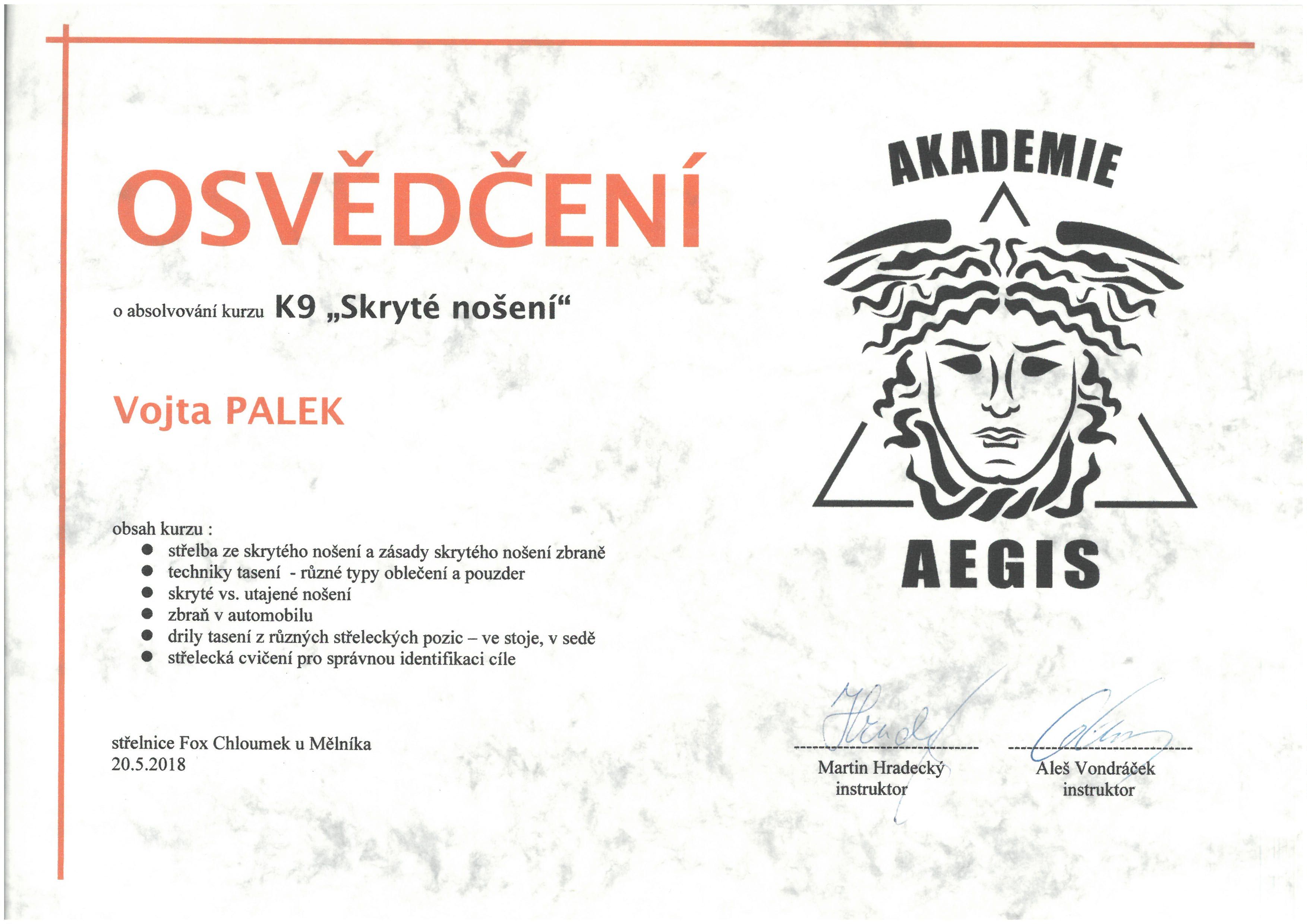 Již 3 měsíce poté, co jsem poprvé, absolvoval kurz K1, jsem se snažil dostat na kurz K9. Bohužel se mi to nepovedlo a teď musím konstatovat, že to bylo dobře. Mezitím jsem totiž dokázal daleko lépe zvládnout náplň kurzu K1, po půlroce si kurz K1 zopakovat, absolvovat kurz K2, zvládnout náplň kurzu K2, a po dalším půlroce si zopakovat kurz K2. To vše za velice intenzivního každodenního suchého tréninku a každotýdenního ostrého tréninku. Podařilo se mi tak dost dobře zažehlit a pochopit techniky z obou těchto kurzů a byl jsem tak připraven na novou dávku informací. Když jsem zjistil, že je vypsaný termín na kurz K9 a je ještě volné místo, neváhal jsem ani vteřinu a okamžitě posílal vyplněnou přihlášku. Tentokrát jsem měl štěstí a má přihláška byla potvrzena. Měl jsem za sebou již 8 dnů strávených s instruktory Alešem Vondráčkem a Martinem Hradeckým na střelnici Chloumek u Mělníka na předchozích kurzech K1 a K2, a tak jsem velice dobře věděl, že mě čeká příjemně strávený den, během kterého se naučím něco nového a procvičím to, co již umím zase trochu jinak než obvykle. V neděli ráno 20.května 2018, jsme se sešli za nádherného počasí připraveni k nabývání dalších vědomostí. Nejprve opět proběhla kontrola ZP a PZ a následovalo krátké rozstřílení. Během tohoto jednodenního nástavbového kurzu jsme se učili: otočku do boku s tasením, celou otočku s tasením, nácvik identifikace cíle, dvě varianty obouručního tasení, tři varianty tasení dominantní rukou, tasení ze zapnuté bundy, tasení z pod vesty, tasení z pod mikiny, tasení v sedě, tasení v autě a použití zbraně v autě, bezpečnostní pravidla v autě. Po přestávce na oběd, byl teoretický blok zaměřený na problematiku skrytého a utajeného nošení a správný výběr oblečení. A na závěr opět modelová situace, tentokrát na čas. Za celý den jsme vystříleli přibližně 300 nábojů a v samotném závěru nás čekalo již povinné hodnocení účastníků. Já sám jsem dostal hodnocení, které jsem ani nečekal, velice pozitivní a motivující. Byla to pro mě ta nejlepší odměna a zároveň zhodnocení mého dosavadního patnácti měsíčního tréninku. Což mě zároveň povzbudilo do dalšího tréninku. Několik důležitých informací, které by měli všichni, kteří se rozhodnou tento kurz absolvovat vědět. Kromě toho, co jsem již psal u kurzu K1, které platí i pro kurz K9: