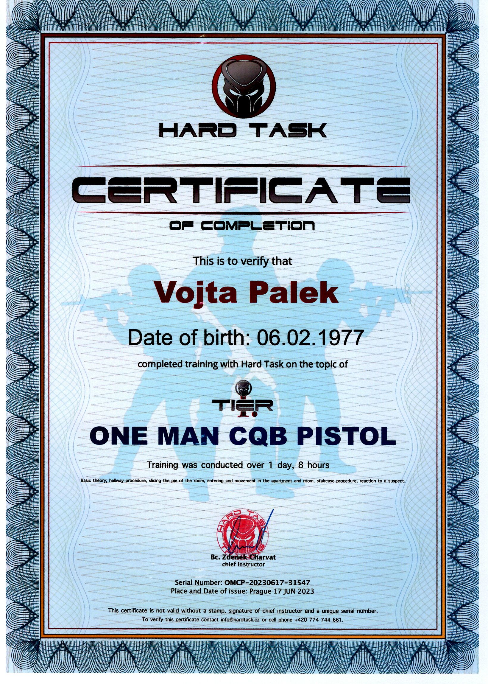 Již nějakou dobu jsem chtěl absolvovat kurz CQB. Ale nebylo kde. Akademie Aegis takový kurz nenabízí a Hard Task až do nedávna, také ne. Tedy jeden kurz měli, ale v něm se využívala jak krátká tak dlouhá zbraň a hlavně byl zaměřený na spolupráci ve větší či menší skupině. Takže byl určený hlavně pro ozbrojené složky. Když jsem na začátku roku 2023 zjistil, že Hard Task připravil kurz One man CQB pistol, tak jsem dlouho neotálel a přihlásil se, protože to bylo přesně to, co jsem hledal. Hlavní náplní kurzu je výuka taktických postupů jednotlivce s krátkou zbraní při pohybu v objektech. Nejprve se vyučuje základní teorie, následuje postup chodbou, vykrajování místnosti, vstup do bytu a místnosti, postup a řešení situace v bytě, postup po schodišti a reakce na osobu. Na kurzu se nepoužívají ostré zbraně, ale cvičené FX Simunition. Jediné, co je potřeba s sebou, jsou střelecké brýle. Kurz by měl začínat v 9 hodin a končit v 18 hodin. Během dne by měla být půl hodinová přestávka na oběd. Kurz, na který jsem se hlásil, bude probíhat v kladenské Poldovce. Jediné, co mě trochu zarazilo, bylo, že nikde nejsou uvedena jména instruktorů, kteří kurz vedou. Nevím, jestli je to záměr anebo jen nedopatření, ale je to divné. Tak snad jsem nekoupil zajíce v pytli. Jinak přihlášení na kurz a potvrzení proběhlo standardně rychle. Měsíc před začátkem kurzu jsem provedl platbu. Vzápětí jsem dostal potvrzení o zaplacení kurzu. Zhruba o týden později jsem se všiml, že u kurzu, na který jsem přihlášený, se již objevila jména instruktorů. Pavel Gregory a Aneta Hámorská. S Pavlem jsem se již setkal na kurzu Tactical Shotgun 1. S Anetou jsem zatím neměl příležitost se potkat. Před konáním kurzu jsem ještě zhlédl video CQB Basic, které je umístěno na YouTube. V sobotu ráno jsem po krátkém bloudění dorazil k budově, ve které se měl kurz konat. Na místě již čekalo několik dalších lidí. Po krátké chvíli přijeli i Pavel s Anetou a za nimi několik dalších účastníků kurzu. 3 lidé nedorazili, takže nás bylo celkem 12. Před devátou hodinou jsme šli do horního patra bývalé administrativní budovy a usadili se v zasedačce. Po krátkém seznámení s průběhem kurzu každý z účastníků dostal svoji zbraň FX Simunition Glock 17, zásobník, 10ks střeliva a vnější opaskové pouzdro. Zbraně jsme si hned na začátku nabili a uložili do pouzdra na opasku. Kurz byl zahájen krátkým teoretickým blokem. Ten trval přibližně půl hodiny. Po něm jsme se vrhli na praktickou část kurzu. Nejprve jsme probírali nejvhodnější pohotovostní polohu pro postup v budově. Dále chůzi po chodbě v před a v zad. Projití po chodbě okolo dveří z jedné strany a mezi dveřmi z obou stran. Následovalo vykrajování a rychlé nahlédnutí do místnosti. Dále pak chůze po schodech dolu a nahoru. Prostup dveřmi a nakonec komunikace s útočníkem. Vše nám instruktoři nejprve vysvětlili a následně jsme si to opakovaně zkoušeli. Teprve až když nám to jakž takž šlo, jsme začali další téma. Od vykrajování jsme se rozdělili do dvojic, kdy vždy jeden z dvojice byl v místnosti a druhý se snažil místnost vykrájet tak, aby svého parťáka uvnitř viděl dříve, než on jeho. Navzájem jsme si pak hlásili, kdo vidí jakou část těla. Takže jsme věděli, na co si při dalším opakování dát pozor. V objektu je spousta místností, a postupně jsme se vystřídali snad ve všech. Při nácviku rychlého přesunu přes dveře, měl člověk uvnitř za úkol střelit svého kolegu na chodbě. Ten byl tak motivován, aby se přesunul co nejrychleji. Zásahů tam ale moc nebylo. Stejně probíhal i nácvik rychlého nahlédnutí do místnosti, kde nahlížející měl identifikovat to, co držel člověk uvnitř v ruce. Ten se měl pokusit být rychlejší a nahlížejícího střelit. Kupodivu i zde střelci moc úspěšní nebyli. Následně se vždy jeden z dvojice schoval v jedné z místností a druhý ho měl najít. Opět jsme vystřídali většinu místností. Kolem jedné hodiny jsme měli půl hodinovou pauzu na oběd. Po obědě jsme se ještě nějakou dobu věnovali nácviku všech dovedností, až jsme se dostali k závěrečným modelovým situacím. V průběhu celého kurzu se mi potvrzovalo to, co jsem si myslel. Že prohledávat nějaký objekt v jedné osobě je nesmírně rizikové a že když ten zlej uvnitř bude motivovanej a odhodlanej, tak mám výrazně menší šanci na úspěch, než on. Na modelové situace bylo určeno pořadí a já jsem šel na řadu jako poslední. Měl jsem tak dost času, si všechno, co jsme se učili srovnat v hlavě. Když jsem přišel na řadu, tak mě Pavel uvedl do kontextu, ve kterém se daná situace odehrává a šel jsem na to. Z modelové situace jsem vyšel jako vítěz, tedy zdravý a živý a bez hrozby následného trestního stíhání. Jedna drobnost by šla udělat lépe, ale celkově jsem dostal dobré hodnocení. Následovala příprava druhé modelové situace. Pořadí bylo stejné, takže opět čekání. Potom obeznámení se situací a akce. I tentokrát se moje řešení obešlo bez střelby a bez ztráty pomyslné kytičky a vlastně i bez připomínek a s pochvalou. Vzhledem k mým pochybám, o možnosti v jedné osobě zvrátit taktickou nevýhodu hledajícího, ve svůj prospěch, jsem měl o to větší radost. Ta vzrostla potom, co jsem od ostatních účastníků slyšel, že ne vždy se jim to povedlo. Na závěr jsme se ještě jednou přesunuli do zasedací místnosti. Vybili a odevzdali jsme zbraně a nevyužité střelivo. Následně jsme dostali účastnický certifikát a zhodnotili jsme průběh kurzu. Ve čtvrt na šest kurz skončil a vydali jsme se na cestu domů. Navzdory mé dopolední frustraci z toho, jak sna